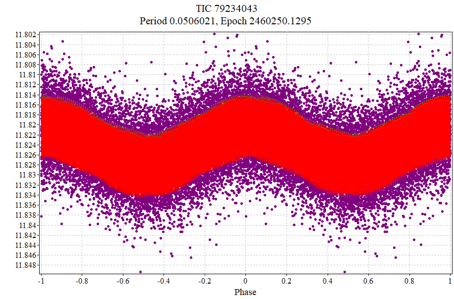 Phase plot with TESS data and model. The model built with the periods of 0.0506021, 0.0554973, 0.0511909, 0.0481879 days.
