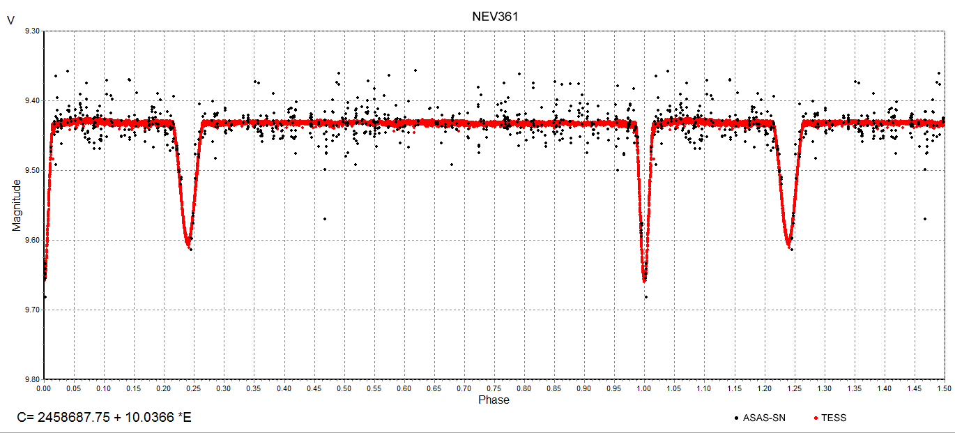 Phase plot with ASAS-SN and TESS data (TESS uses a red-optical bandpass covering the wavelength range from about 600 to 1000 nm). |