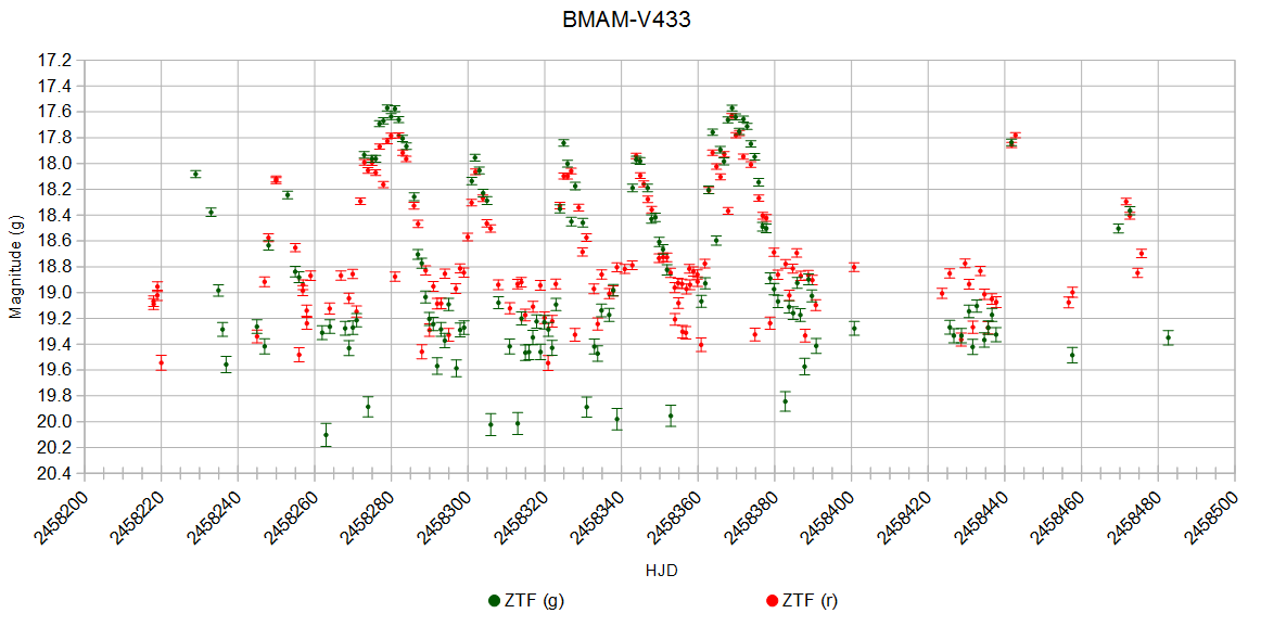 HJD light curve data from ZTF g and ZTF r shifted to g standard (mag offset = 0.40).