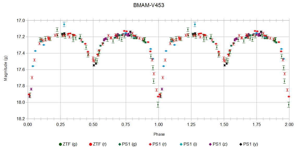 Phase plot data from ZTF and Pan-STARRS1 shifted to g standard.