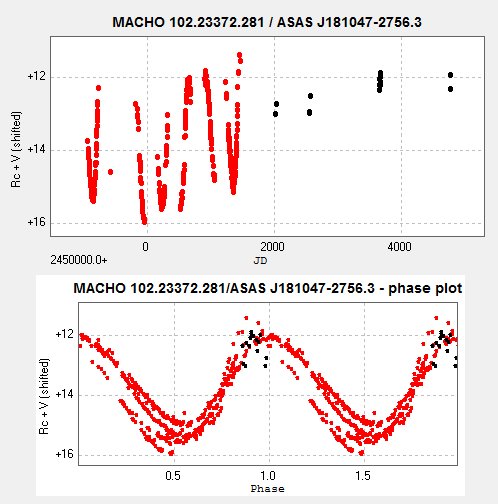 Light curve and phase plot based on MACHO Rc data (red) and ASAS V data (black). ASAS V has been shifted to match MACHO Rc.