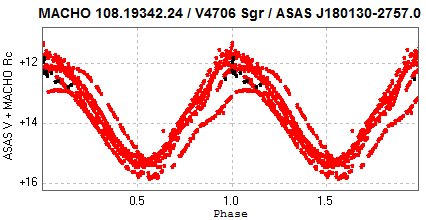 Phase plot based on MACHO Rc data (red) and ASAS V data (black). ASAS V has been shifted to match MACHO Rc.