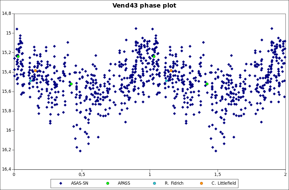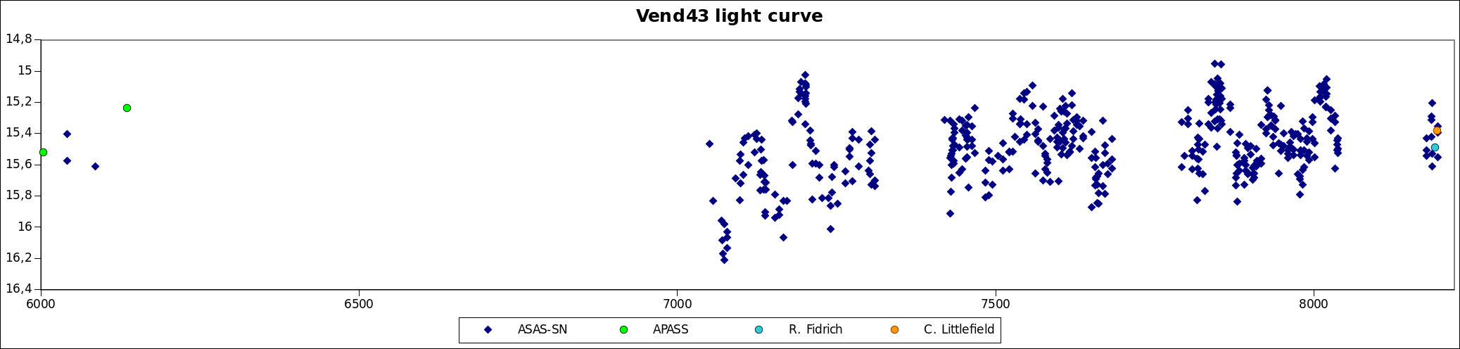 Light curve of Vend43 based on ASAS-SN and APASS V data and CCD V photometry of Robert Fidrich and Colin Littlefield.