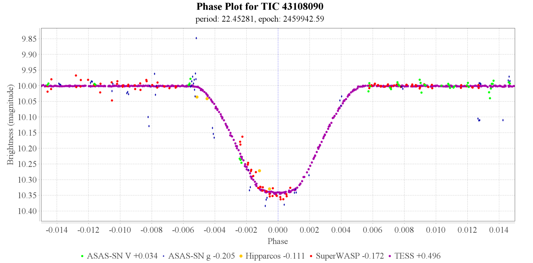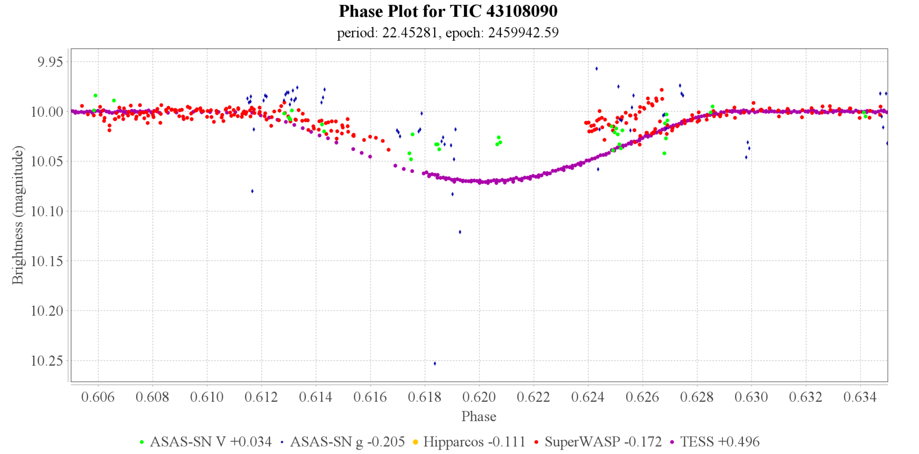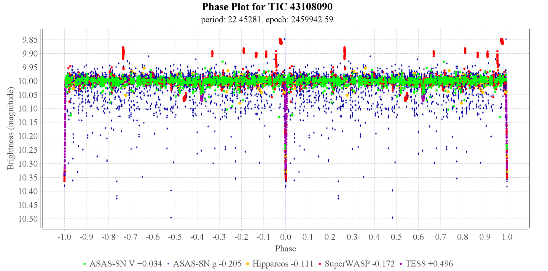 Phase plot with TESS QLP, ASAS-SN, HIPPARCOS, and SuperWASP data. |