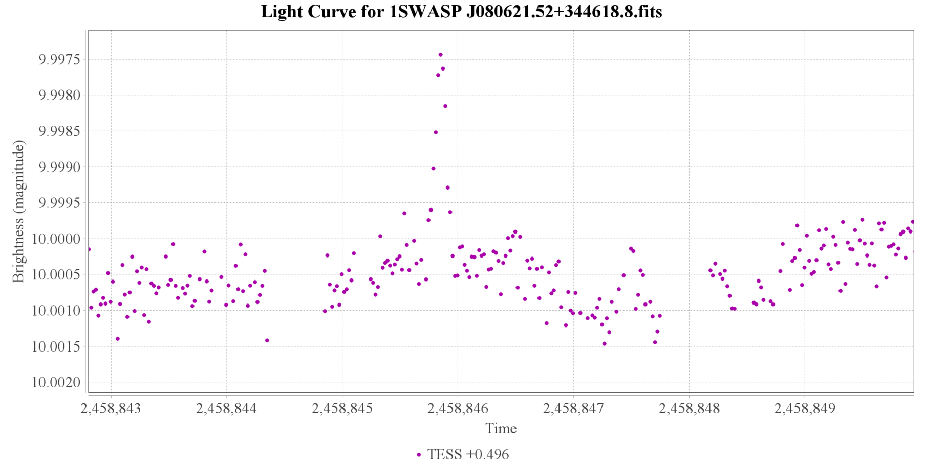 J-K= 0.37. Eccentric system. Min II 10.03 V, phase 0.62, duration 1.8%. Flare-like (although symmetric) brightening with a 0.003 TESS amplitude at HJD 2458845.8 in TESS data. |