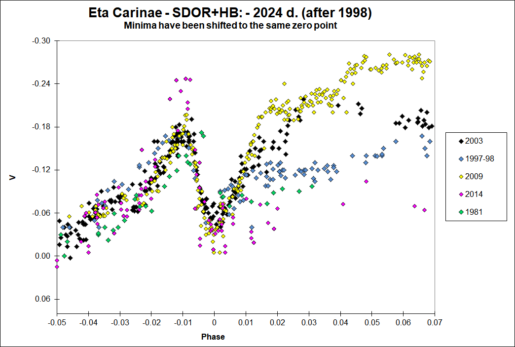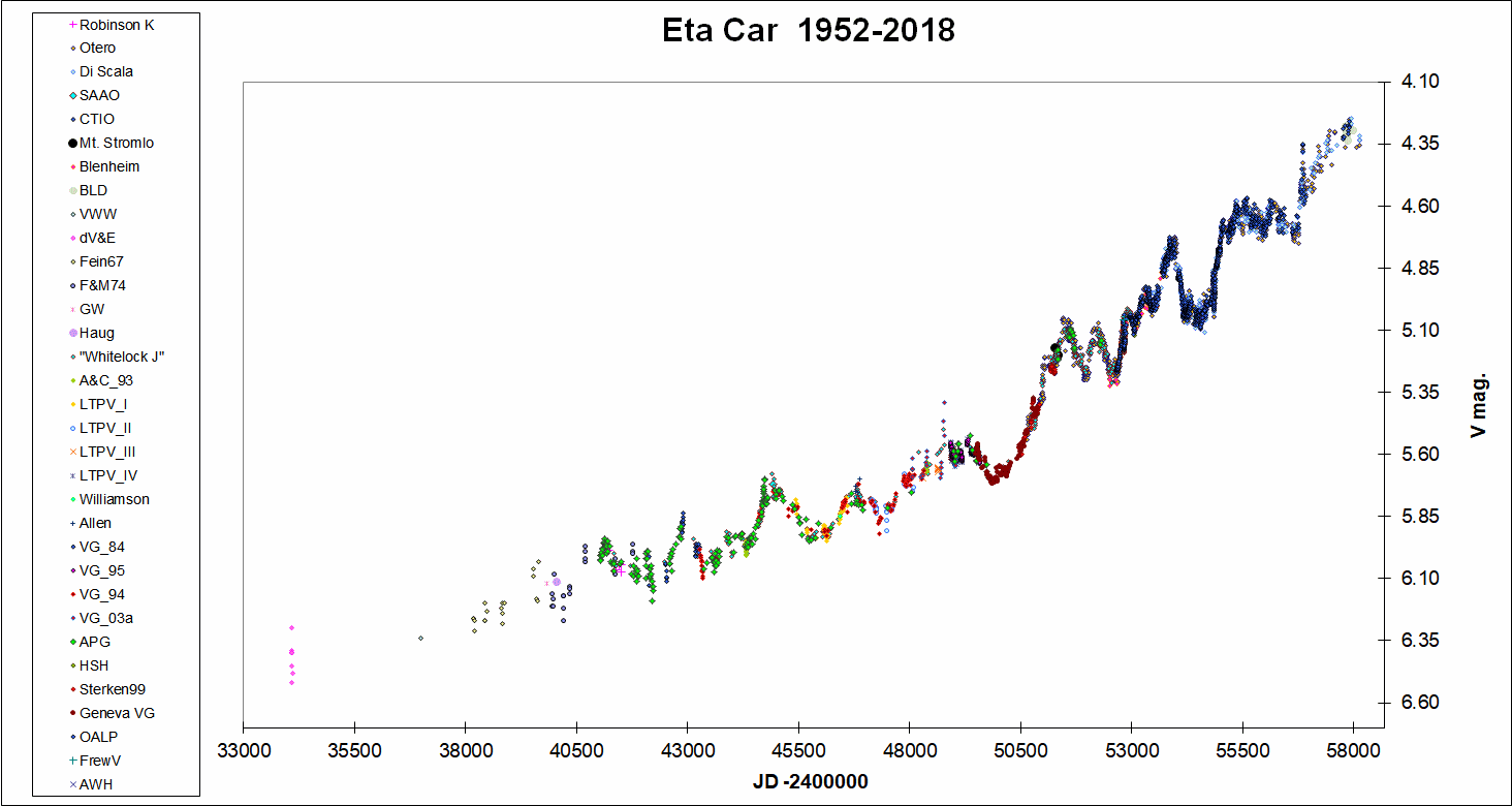 . A pulsation period of 58.8 d. was found. On January 2018, eta Carinae is around V= 4.3 with small amplitude fluctuations (~0.1 mag.). The elements given in the table are for the recent visual minima accompanying the X-ray minima. Historical data reveal several period changes coincident with mass ejection events. Before the 1844 eruption P= 1922 d. Second eruption in 1887. Third smaller eruption in 1941 (