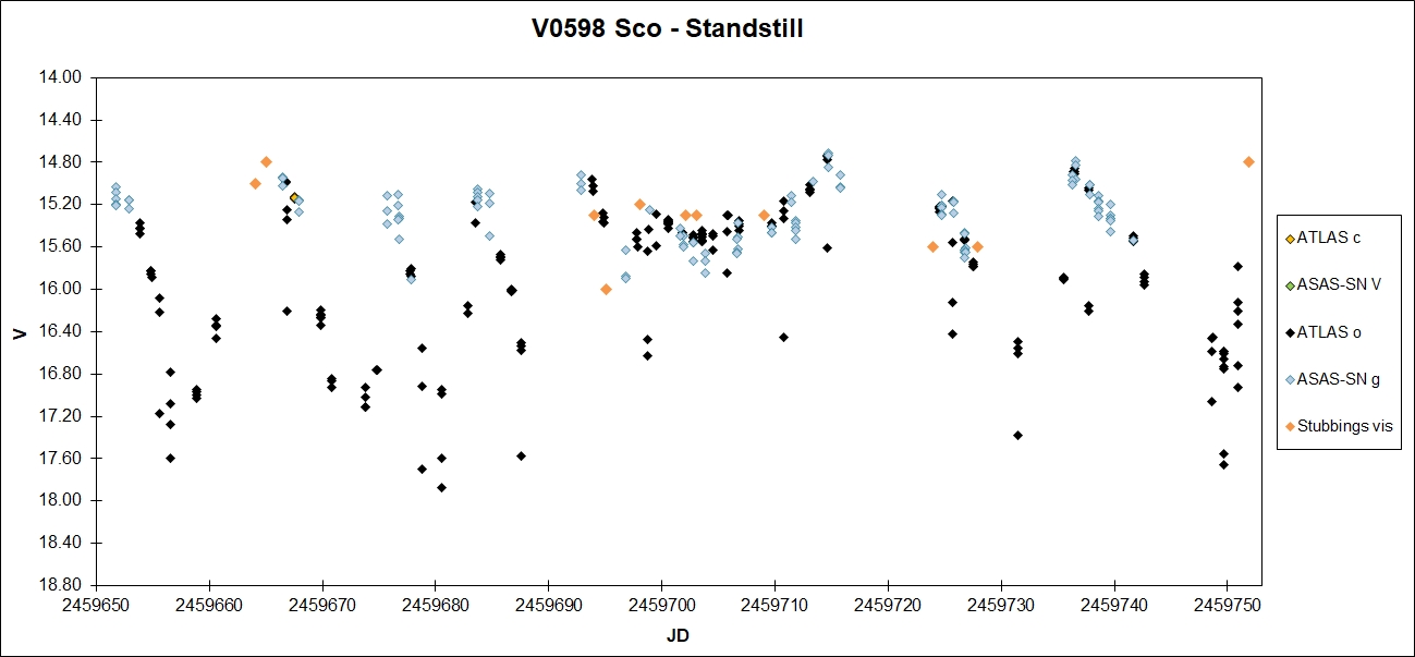 Eclipses discovered visually by Rod Stubbings. Standstill between HJD 2459698 and 2459713. |